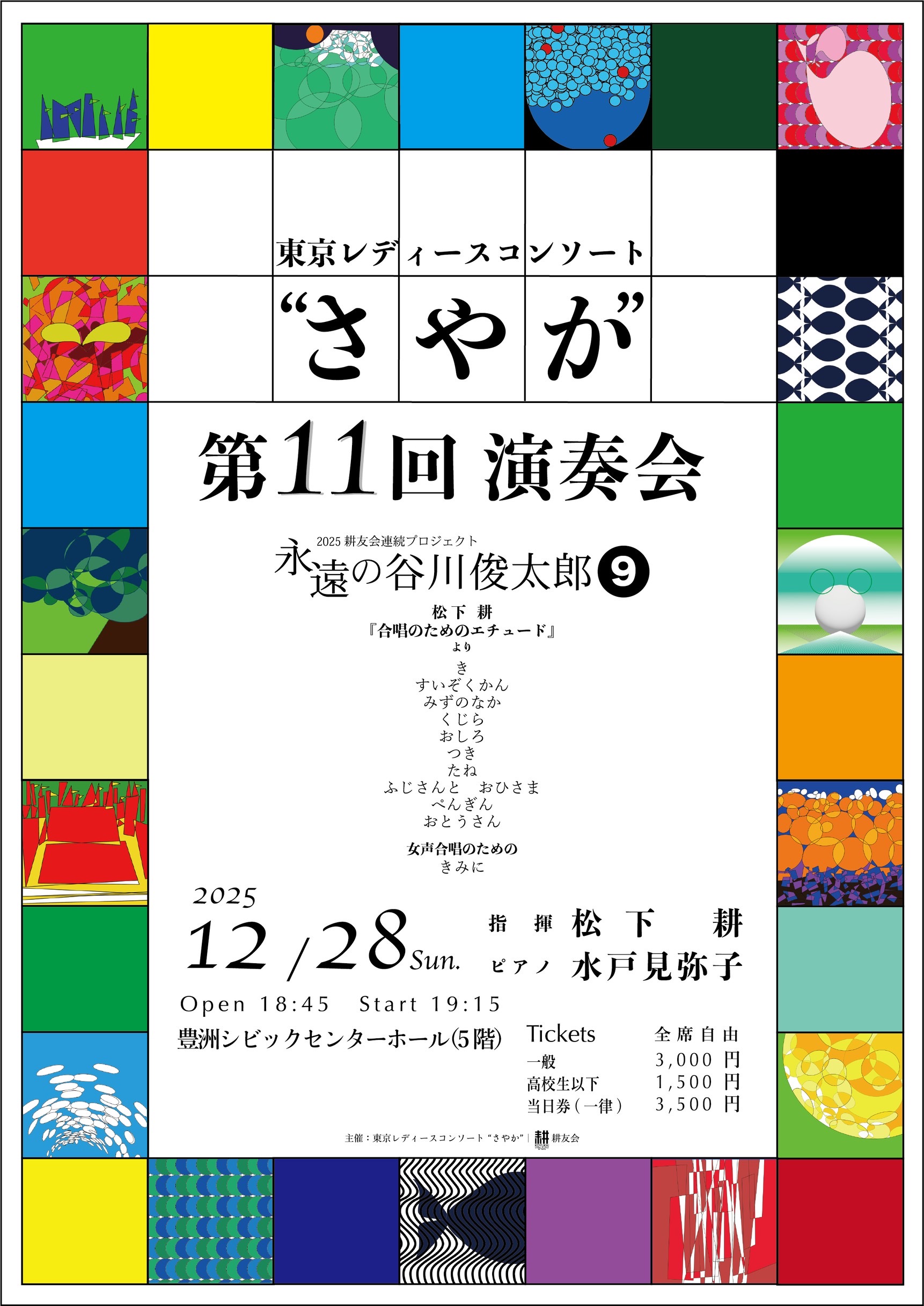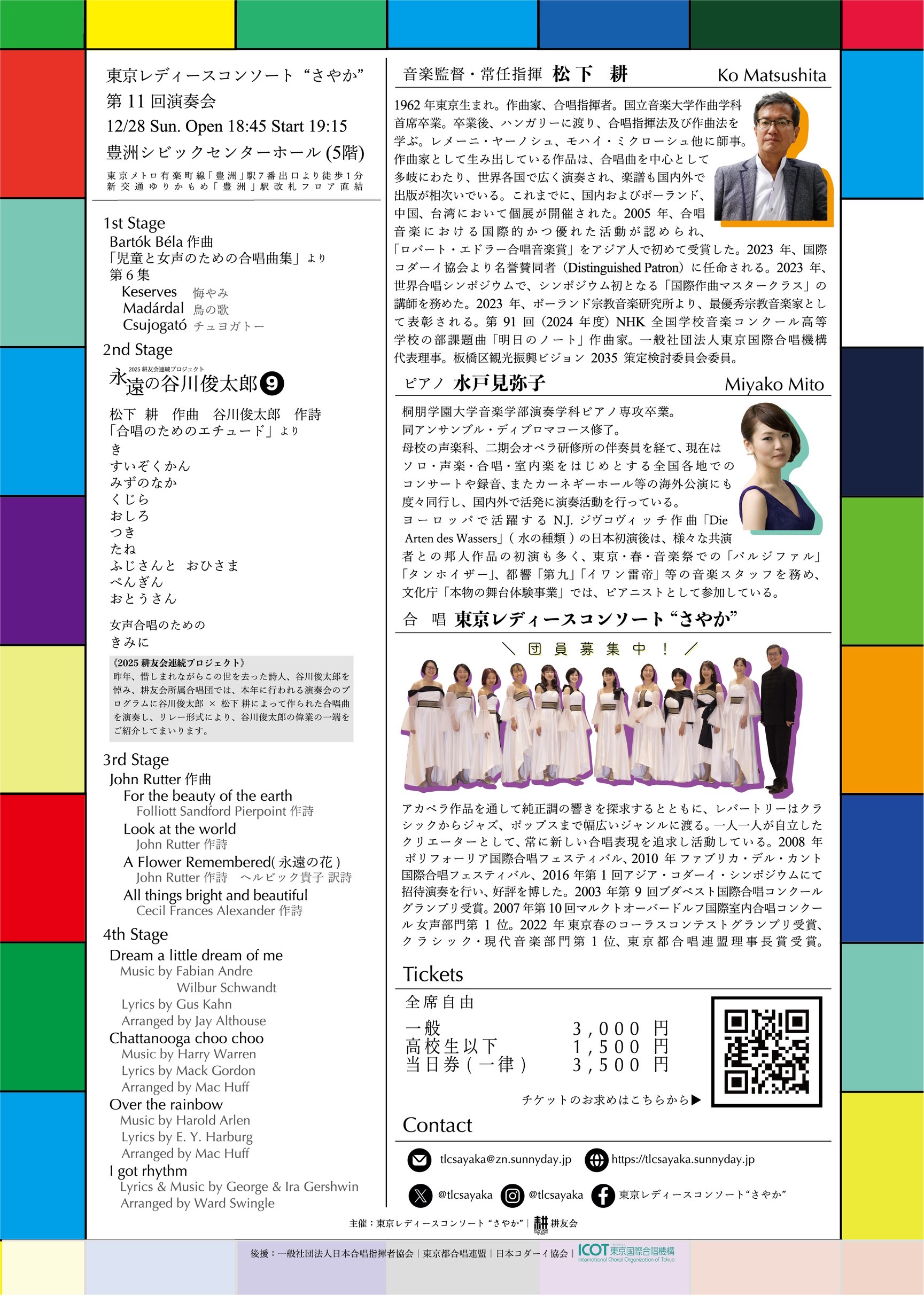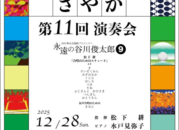 昨年逝去された谷川俊太郎の作詩、松下耕作曲の作品を、耕友会プロジェクト企画としてシリーズで取り上げている第9弾で、このさやかの演奏会では、「合唱のためのエチュード」から10曲を演奏する。その他、毎回の演奏会でシリーズ化しているバルトーク作曲の「児童と女声のための合唱曲集」より第6集、イギリスの作曲家・ジョンラターの作品等を演奏する。